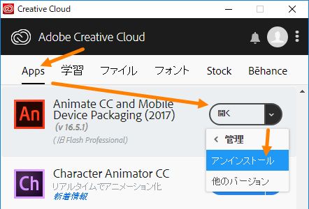 インストールされているアプリケーションの一覧で Animate を探し、その名前の上にカーソルを置きます。