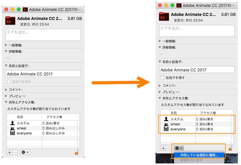アクションポップアップメニュー(歯車アイコン)をクリックして、「内包している項目に適用」を選択します。