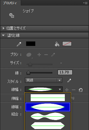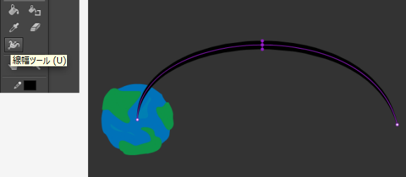 可変線幅の線をパスとして定義した後、そのモーショントゥイーンを実行すると、オブジェクトがパスに従って動くのに加え、線の太さの変化に対応してサイズも変化することを確認できます。