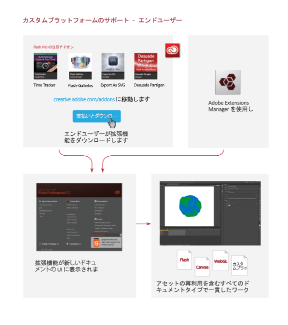 Animate は、ActionScript、HTML5、WebGL などのドキュメントタイプを使用したリッチなグラフィックやアニメーションの作成をサポートしています。カスタムプラットフォームサポート機能は、この Animate の強力な機能を、Animate ネイティブではないプラットフォームにまで拡張します。