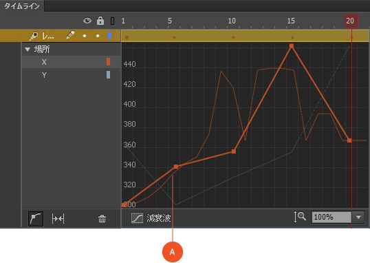 - 結果の曲線:個々のプロパティにイージングを適用し、結果の曲線を使用して、個々のプロパティのグラフにおけるイージングの効果を確認できます。結果の曲線は、実際のトゥイーンを表現したものです。
