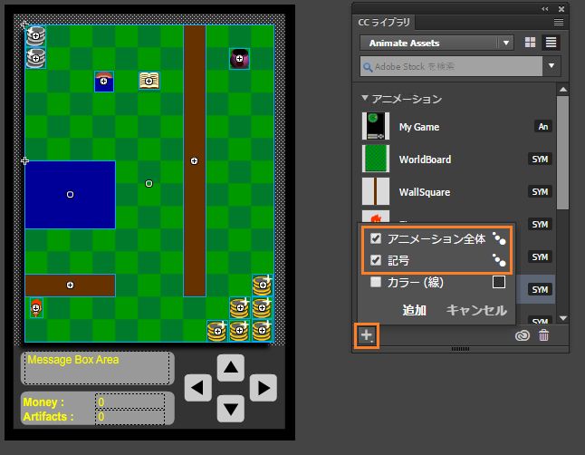 ステージのシンボルを選択し、CC ライブラリパネルのフッターで + ボタンをクリックして、ポップアップウィンドウを表示します。