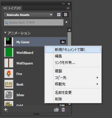 - 「新しいドキュメントとして開く」:選択したアニメーションを新しいドキュメントとして開きます。または、アニメーションをステージにドラッグ&ドロップすることもできます。