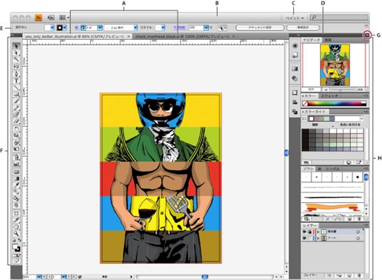 A. タブ付きドキュメントウィンドウ B. アプリケーションバー C. ワークスペース切り替えコントロール D. パネルタイトルバー E. コントロールパネル F. ツールパネル G. アイコンパネル化ボタン H. 縦方向にドッキングした 4 つのパネルグループ