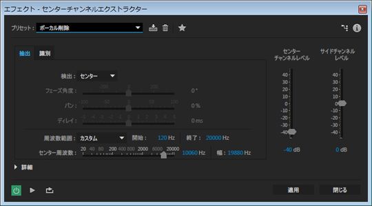 注意 :センターチャンネルエクストラクターエフェクトは、ステレオファイルに対してのみ有効です。