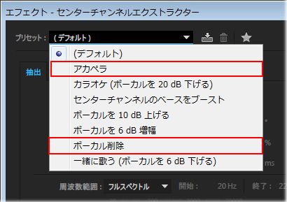 Audition CC2015 のセンターチャンネルエクストラクターエフェクトを使用して、オーディオファイルからボーカルや特定の楽器(インストゥルメンタル)のみを抽出することができます。