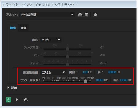 抽出または削除する範囲を設定します。 定義済みの範囲として、「男性の声」、「女性の声」、「バス」および「フルスペクトル」があります。 周波数範囲を独自に定義する場合は、「カスタム」に設定します。