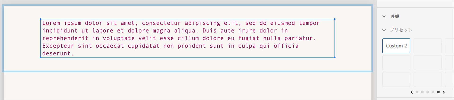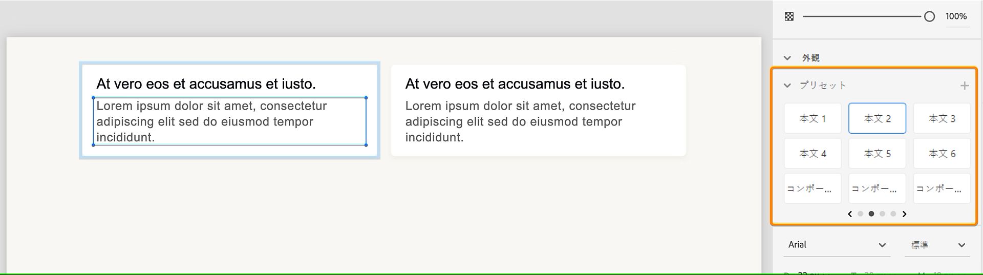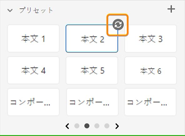 フォントやサイズを変更したり、ボールドやイタリックなどをかけたりなど、プリセットを変更した場合はプリセットを更新できます。 プリセットでプリセットを更新アイコンを選択すると、プリセットに新しいプロパティが継承されます。