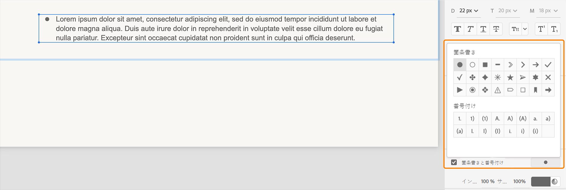 「箇条書きと番号付け」を選択して、選択したテキストを箇条書きに変換します。 複数の箇条書きと番号付きリストのデザインを利用することができます。