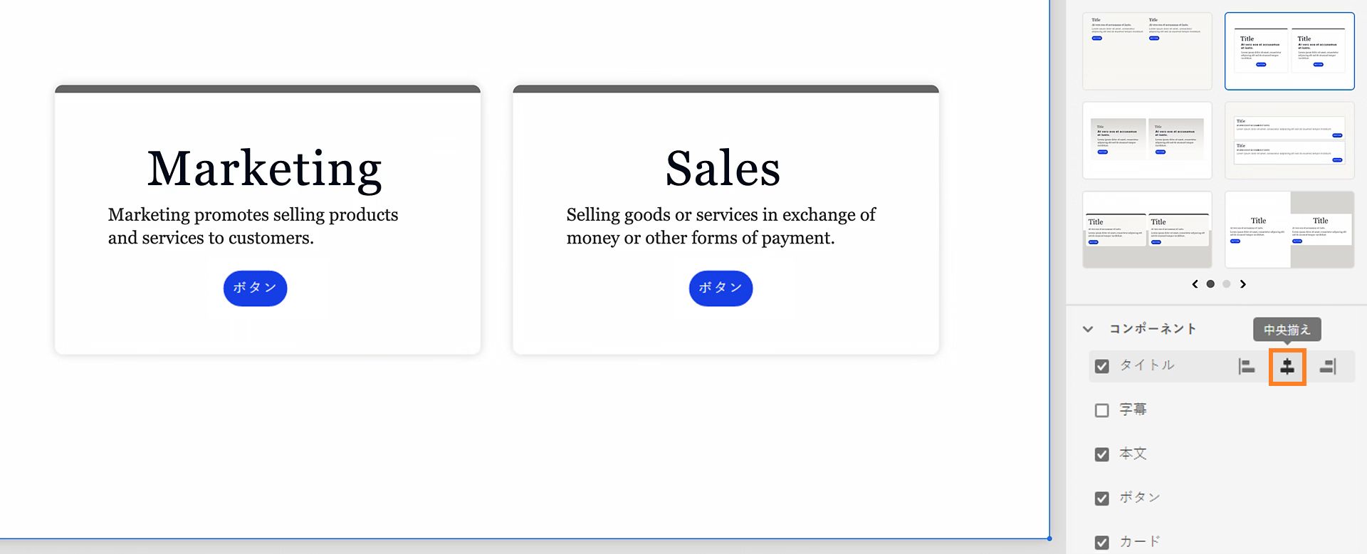 タイトル、字幕、本文またはボタンの配置を変更します。 配置(左揃え、中央揃え、右揃え)を変更するには、タイトルの上にマウスポインターを置き、任意の配置を選択します。