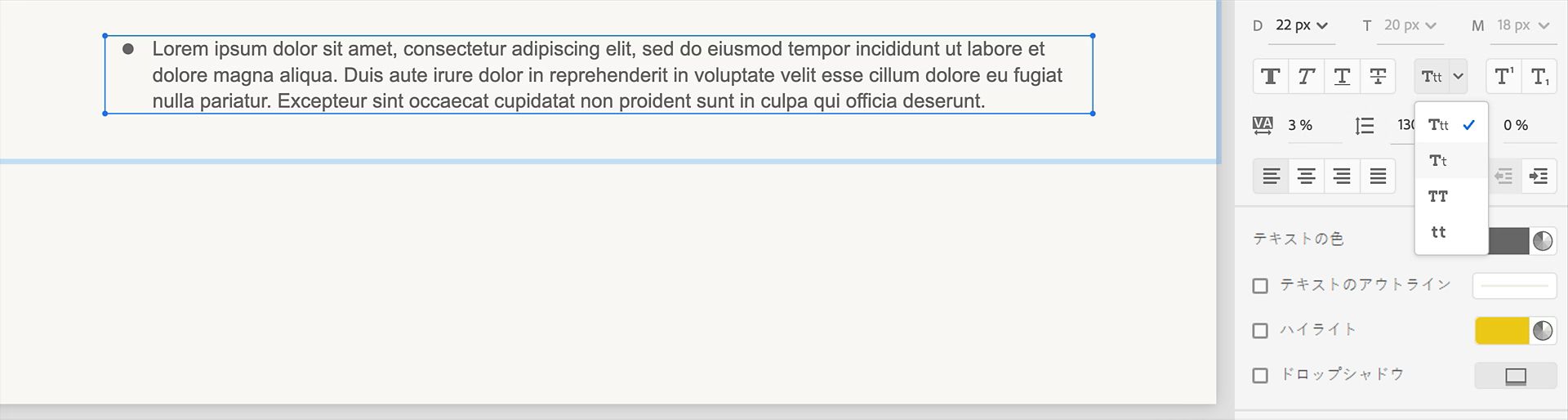 テキストコンテンツブロック内の任意のテキストオブジェクトを選択します。 ビジュアルプロパティパネルには、テキストに適用できるすべてのプロパティが表示されます。