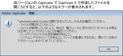 Adobe Captivate 5.5 では、旧バージョンで作成したプロジェクトを開くことが可能ですが、Captivate 5.5 で作成したファイルを旧バージョンで開くことはできません。