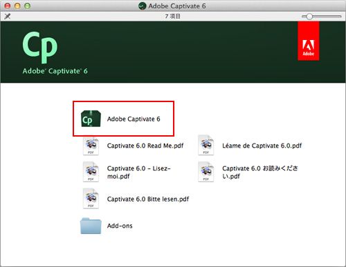 ※ ウインドウが自動的に表示されない場合は、デスクトップにマウントされた Adobe Captivate 6 ディスクアイコンをダブルクリックします。