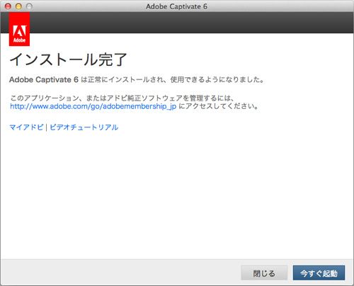 「インストール完了」と表示されたら、「閉じる」をクリックして終了するか、または「今すぐ起動」をクリックすると、そのまま Captivate 6 が起動します。