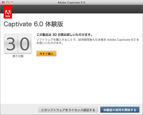Captivate 6 のインストール後 30 日以内にライセンス認証を行う必要があります。ライセンス認証に関する詳細については、アプリケーション DVD-ROM 内の「Captivate 6.0 お読みください.pdf」ファイル、および http://www.adobe.com/jp/activation/ を参照してください。