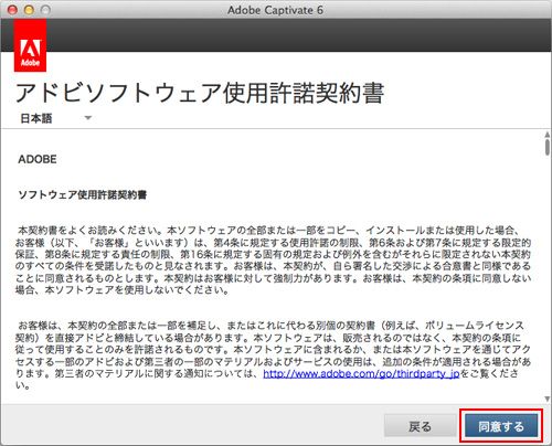 「アドビソフトウェア使用許諾契約書」が表示されます。内容を確認し、「同意する」をクリックします。