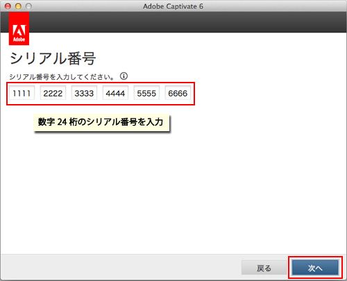 24 桁のシリアル番号を入力し、「次へ」をクリックします。
