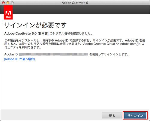 - Adobe ID とパスワードを入力して「サインイン」をクリックします。