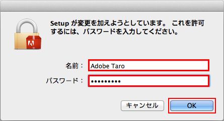 「Setup が変更を加えようとしています。」と表示されたら、パスワードを入力して「OK」をクリックします。