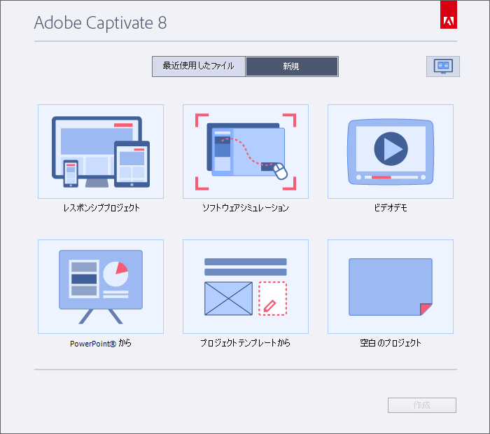 Adobe Captivate 8 を起動後、次の画像のように「新規」タブに新しいプロジェクトを作成する 6 つのサムネイルオプションが表示されます。
