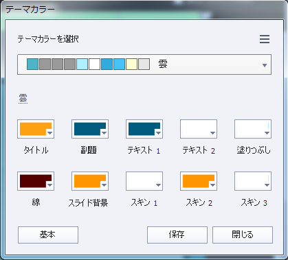 タイトル、スキン、サブタイトル、スライド背景など、スライドの各コンポーネントの色を変更できます。