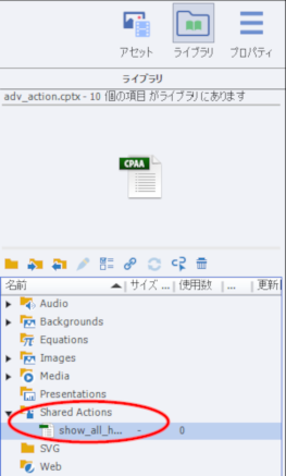 The shared action becomes available in the Advanced Actions dialog box and as a resource in the Adobe Captivate Classic library. Now your action is ready to be shared within a project or across different projects.