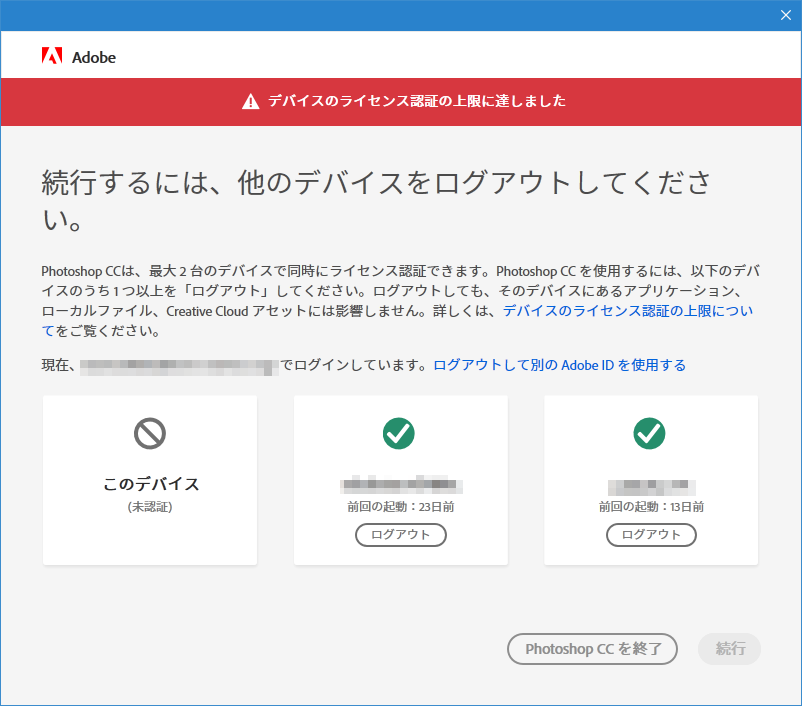 Creative Cloud の起動時に「デバイスのライセンス認証の上限に達しました」メッセージが出た場合の対処を紹介します。