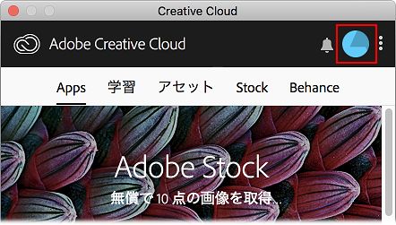 Creative Cloud デスクトップアプリケーションが起動したら、右上のアカウントアイコンをクリックします。