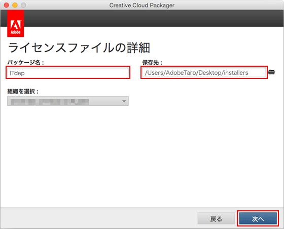 ライセンスファイルの詳細画面が表示されたら、パッケージ名を入力し、保存先を指定して「次へ」をクリックします。