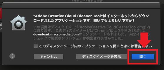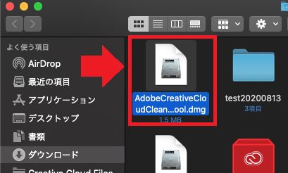 ダウンロードされた「AdobeCreativeCloudCleanerTool.dmg」を開きます。