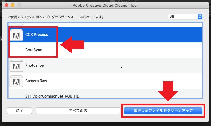 「Adobe Content Synchronizer (CoreSync)」「CCX Process」「CC Library」の 3 つ全てがなくなったら、ツールを終了し 5. 証明書の削除 に進みます。