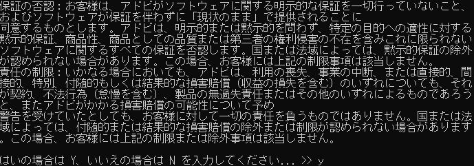 「使用許諾契約」が表示されたら、アルファベットの" y "を入力しEnterキーを押します。