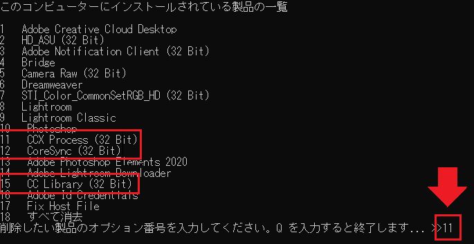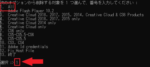 「次のオプションから削除する対象を1つ選んで、番号を入力してください」と表示されたら、"「All」に対応する番号 "を入力しEnterキーを押します。