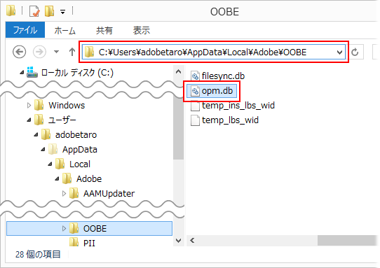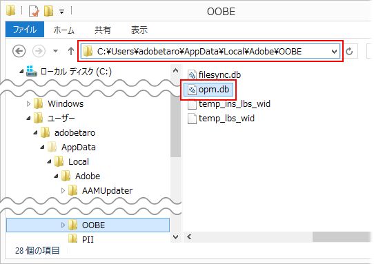 PC/ローカルディスク (C:)/ユーザー/"PCユーザー名"/AppData/Local/Adobe/OOBE/opm.db |
