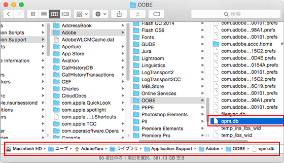 Macintosh HD/ユーザ/ "PCユーザー名" >/Library/Application Support/Adobe/OOBE/opm.db |