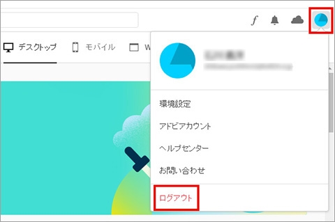 ログイン後の画面にて正常にログインできているか確認します。画面右上の青い丸のアイコン(もしくは設定したAdobe IDのアイコン)をクリック、下に伸びてくるメニューのアカウント名と電子メールアドレスに間違いが無いか確かめます。