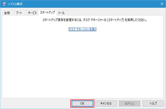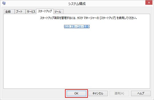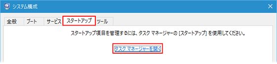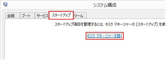 システム構成ダイアログボックスの「スタートアップ」タブを選択し、「タスクマネージャを開く」をクリックします。