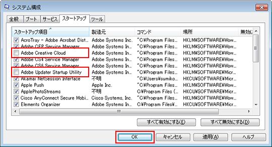 「スタートアップ」タブを選択し、以下の項目のチェックをはずして「OK」をクリックします。