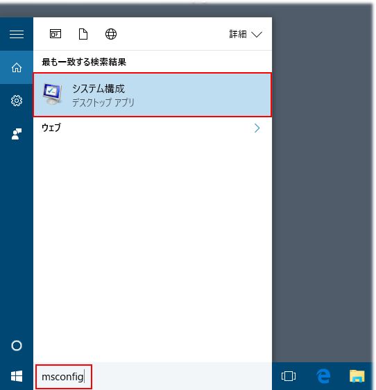 タスクバーの検索ボックスに「msconfig」と入力し、検索結果に表示された「システム構成」をクリックします。