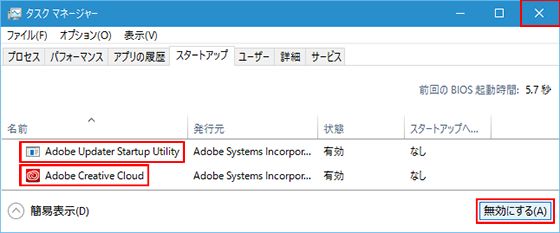 以下の項目を選択して「無効にする」ボタンをクリックし、ウィンドウ右上部の閉じるボタンをクリックします。