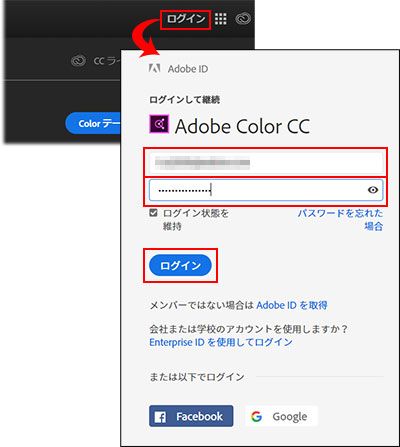 ページ右上の「ログイン」をクリックし、Adobe ID およびパスワードを入力して「ログイン」ボタンをクリックします。