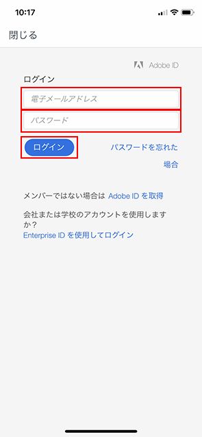 ログイン画面が表示されたら、 Adobe ID(電子メールアドレス)とパスワードを入力して「ログイン」ボタンをタップします。