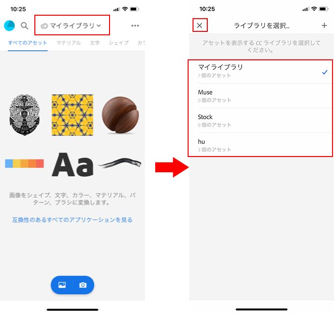 以下のような画面が表示されたら、必要に応じて上部のライブラリメニューをタップして作業するライブラリを変更します。