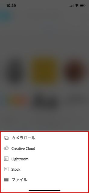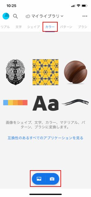 上部メニューの「カラー」をタップし、画面下部の写真アイコンまたはカメラアイコンからカラーの取り込み先を選択します。