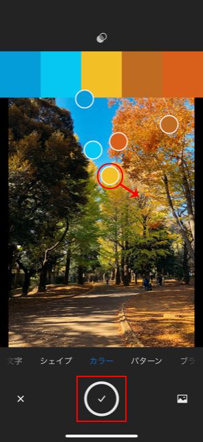 画像から自動的に 5 つのカラーが抽出されます。配色を変更するには、任意の場所にカラーピッカーをドラッグします。カラーの抽出が完了したら、画面下部のチェックアイコンをタップします。