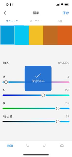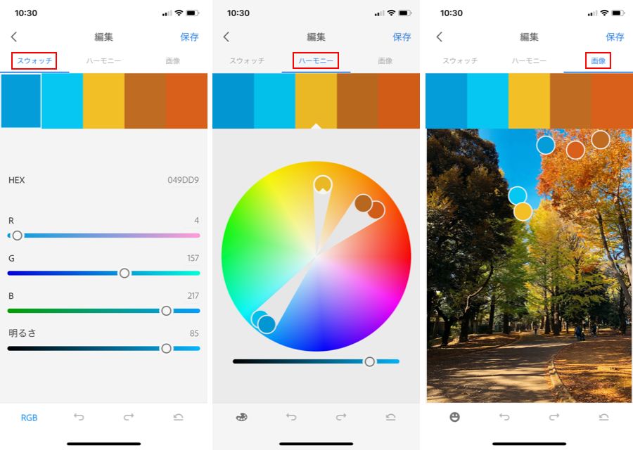 上部のメニューから「スウォッチ」、「ハーモニー」、「画像」を選択し、各ツールを使用してカラーの編集を行います。編集が終了したら画面右上の「完了」ボタンをタップします。
