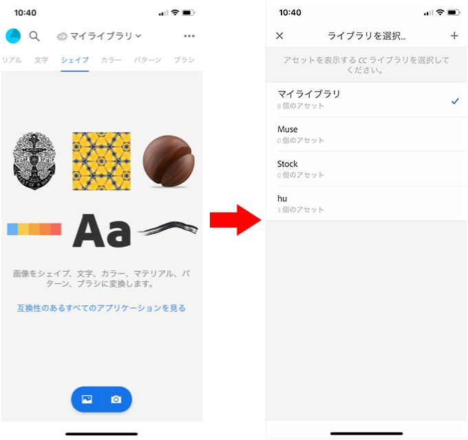 Adobe Capture CC は モバイル端末用のアプリケーションで、写真からカラーテーマやパターン、文字、マテリアル、ブラシ、シェイプなどの素材を作成することができます。作成した素材は、Adobe Photoshop、Illustrator、Dimension、XD、Photoshop Sketch などのデスクトップアプリやモバイルアプリで使用することができます。