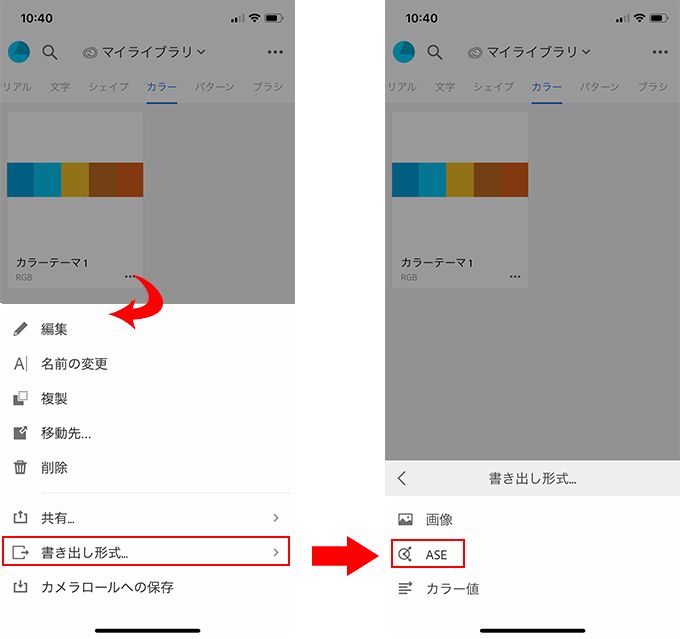 ダウンロードするカラーテーマの右下にある「…」アイコンをタップし、書き出し形式/ASE をタップして保存先を選択します。