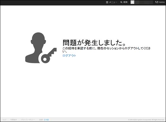 Creative Cloud エンタープライズの招待メールにある「招待を承認」をクリックすると、以下のようなエラーメッセージが表示される