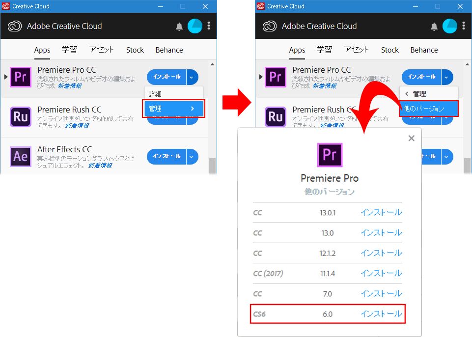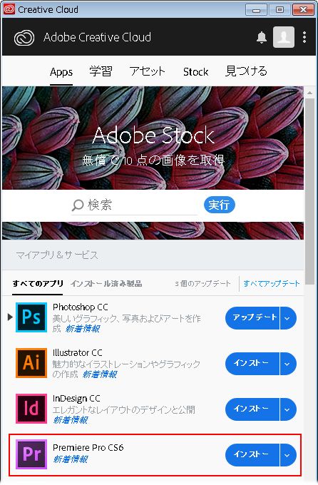 32 ビット版 Windows 環境で、Adobe Creative Cloud デスクトップアプリケーションの「Apps」タブに Adobe Premiere Pro CS6 が表示されます。
